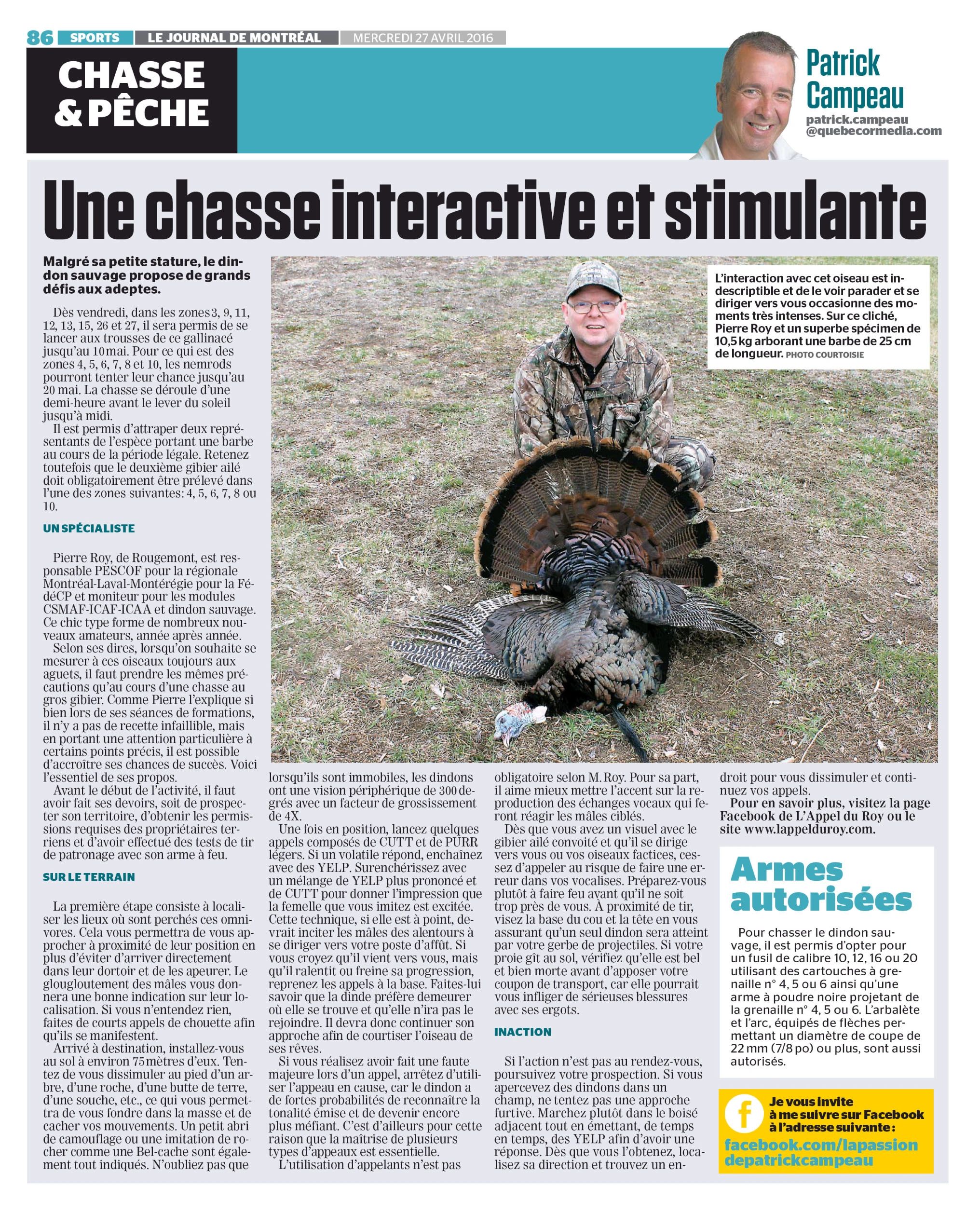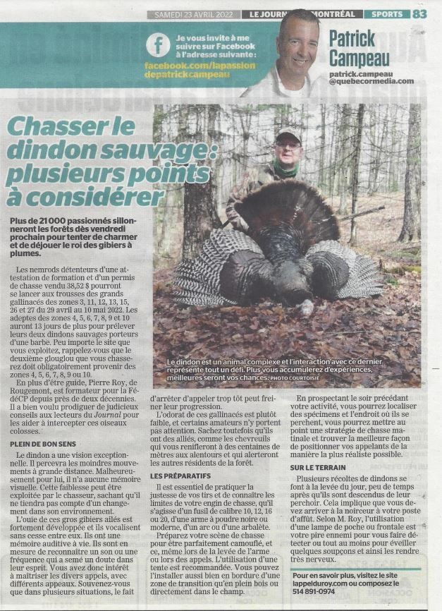 En avril 2016, j'ai eu le plaisir et le privilège d'être contacté par monsieur Patrick Campeau pour une entrevue sur la chasse aux dindons sauvages. Monsieur Campeau est : Pêcheur professionnel, formateur, promoteur et chroniqueur pour ce Journal. Ce fut une expérience des plus agréables.