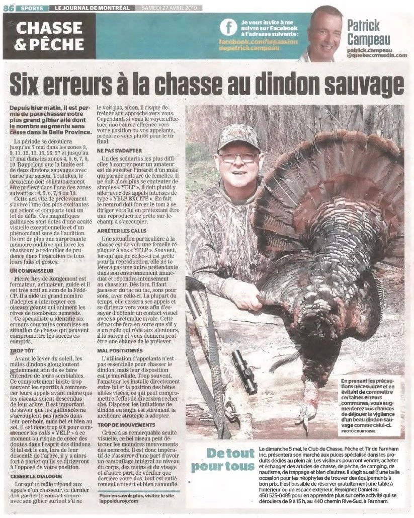 En avril 2019, j'ai eu le plaisir et le privilège de collaborer de nouveau avec monsieur Patrick Campeau qui voulait faire un autre article sur la chasse aux dindons sauvages. Cette fois, l'interview était centrée sur les 6 principales erreurs commises lors d'une chasse aux dindons.