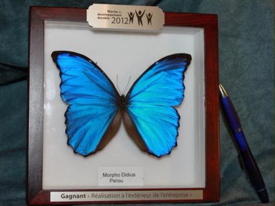 C'est avec plaisir que le comité de sélection a choisi ma candidature et que j'ai remporté le premier prix dans la catégorie "Réalisation à l'extérieur de l'entreprise". J'ai recu un certificat de reconnaissance signé par le PDG monsieur Thierry Vandal, un montant de $500,00 que je devais remettre à l'organisme OSBL de mon choix (je l'ai remis à Nature-Action Québec) et une plaque souvenir ; un magnifique papillon bleu du Pérou (photo). J'ai aussi eu le plaisir d'avoir 2 articles écrits dans des publications internes à Hydro-Québec ; le lien Télécoms et Hydropresse.